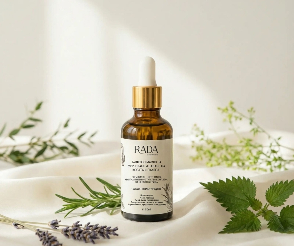 Билково масло за укрепване и баланс на косата и скалпа Rada e 100 % натурално масло за коса със 8 билки и 6 масла, което обединява силата на природата, за да подхрани, укрепи и възстанови косата ти. Благодарение на балансираното си съчетание, продуктът стимулира растежа, овлажнява скалпа и възстановява повредените краища